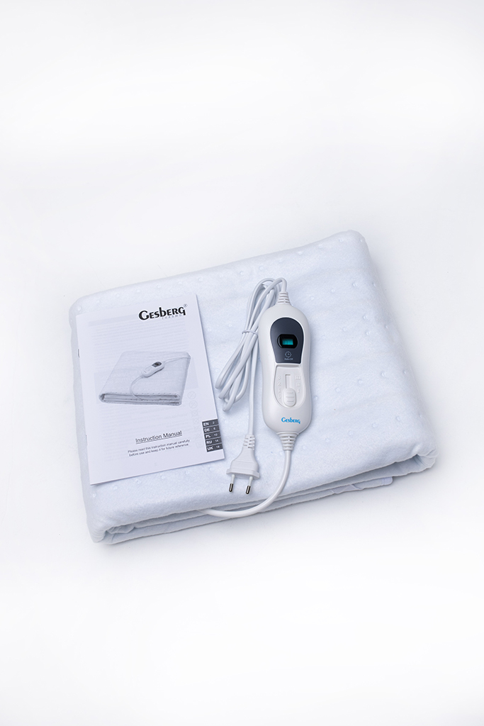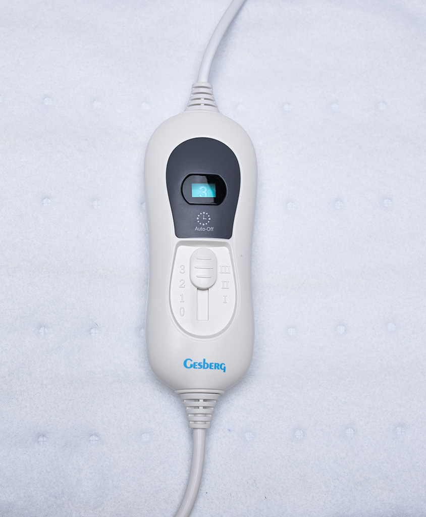 Elektrické prostěradlo Gesberg se zapíná pomocí jednoduchého ovládacího panelu, který poskytuje volbu komfortní úrovně topného výkonu. Ohřev lze vypnout ručně nebo se vypne automaticky 180 minut po zapnutí.